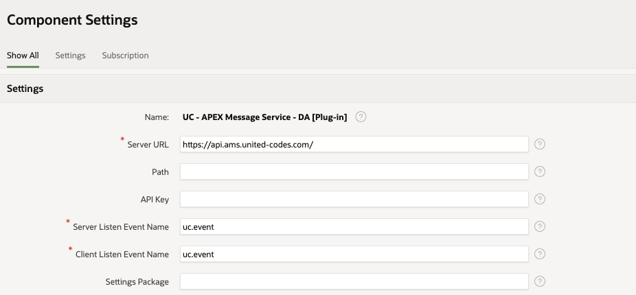 In case you want to update some plug-in settings, you can find the plug-in settings in Shared Components > Component Settings > APEX Message Service (AMS) [Plug-in].