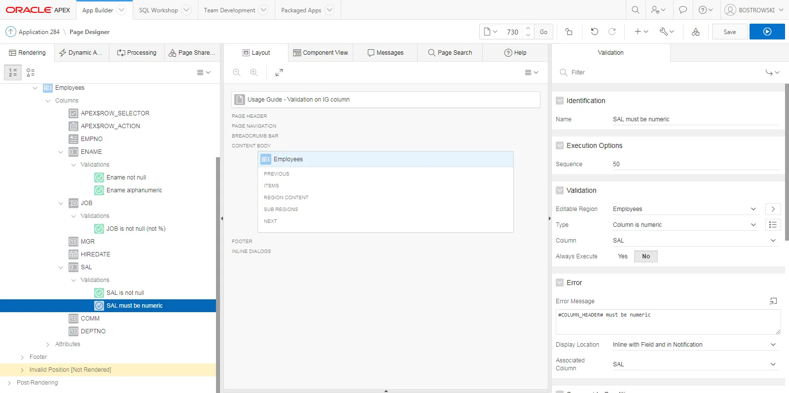 Section titled “Introduction”In an example application, page 730 is defined. On the page, an interactive grid region called Employees is created on the emp table. Columns ENAME, JOB and SAL have native Oracle APEX validations defined as described in the table below: