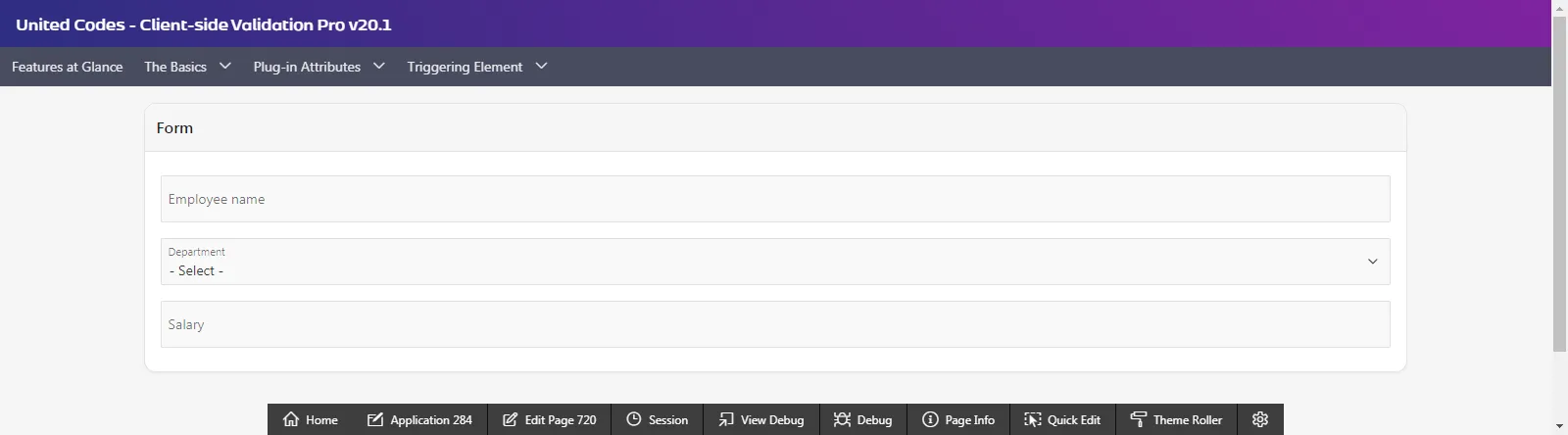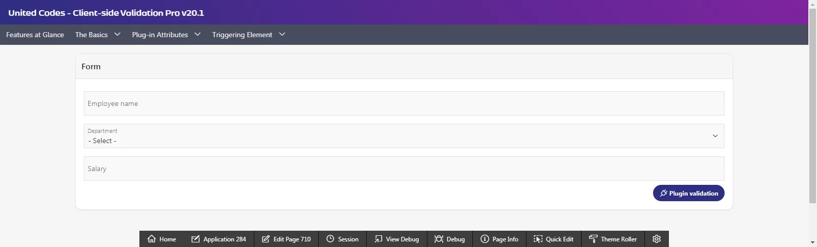 This section describes three basic examples of implementing the plug-in to validate a simple form and interactive grid columns. The usage guide shows a basic implementation of the plug-in but does not describe the plug-in attributes or ideas on how the plug-in can be used.