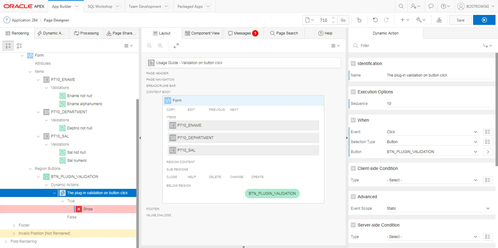 - Change the dynamic action’s name to The plug-in validation on button click
