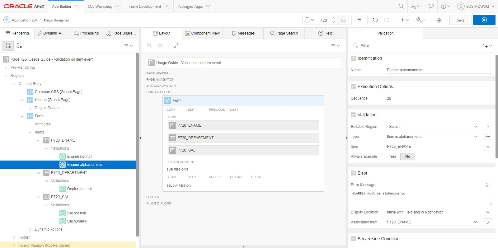 Section titled “Introduction”In an example application, page 720 is created. On the page, a region called Form is created and contains 3 items.
