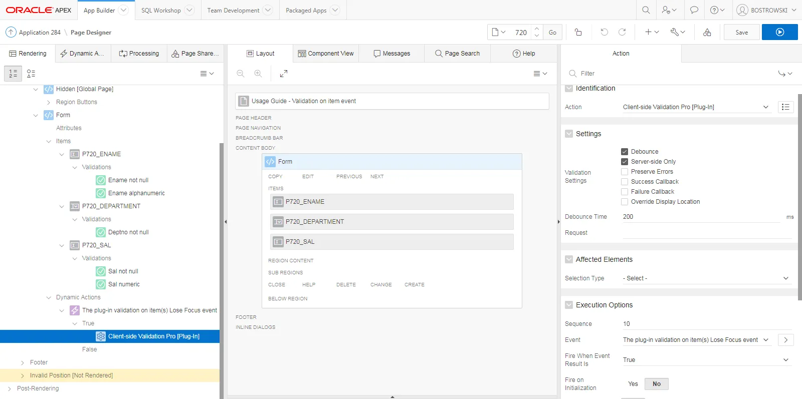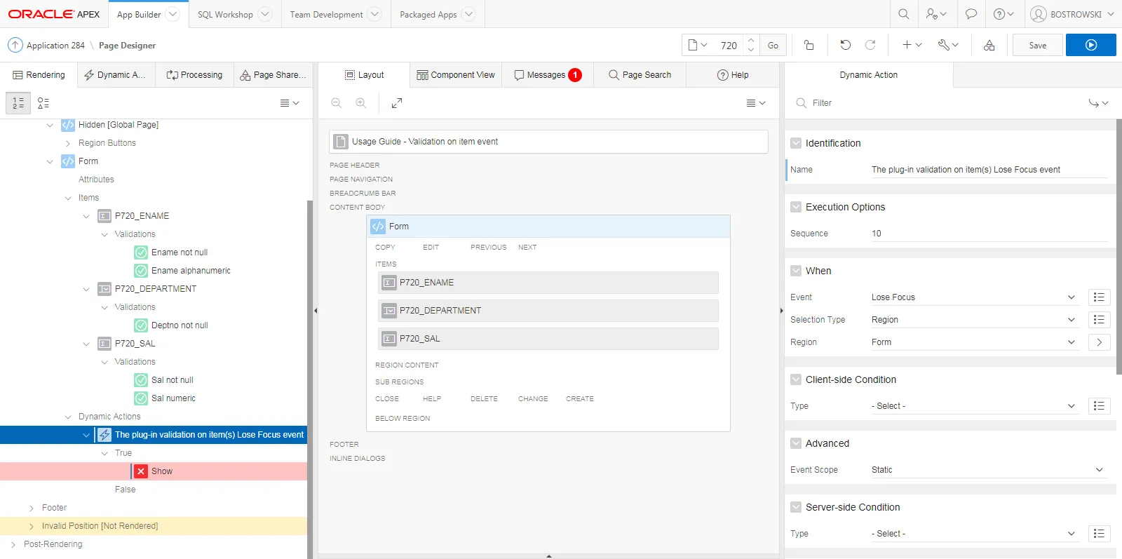 - Change the dynamic action’s name to The plug-in validation on item(s) Lose Focus event