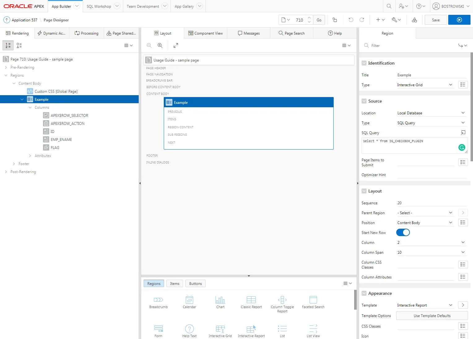Section titled “Introduction”This usage guide is using the plug-in sample application IG_CHECKBOX_PLUGIN table. In an example application, page 710 is created. On the page, an interactive grid region called Example is created and contains three columns ID, EMP_NAME, and FLAG. The ID and EMP_NAME columns are Display Only and the FLAG column is a Text Field. The interactive grid supports editing and the primary key is set as the ID column.