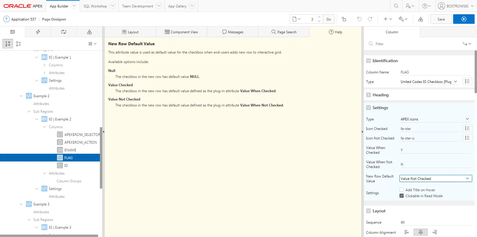 Section titled “Validation”The plug-in has built-in validation which is executed when the interactive grid is saved. If the value of a column using the plug-in is equal to the Value When Checked or Value When Not Checked attribute or is NULL then validation is successful. Otherwise, the built-in validation raises an error.