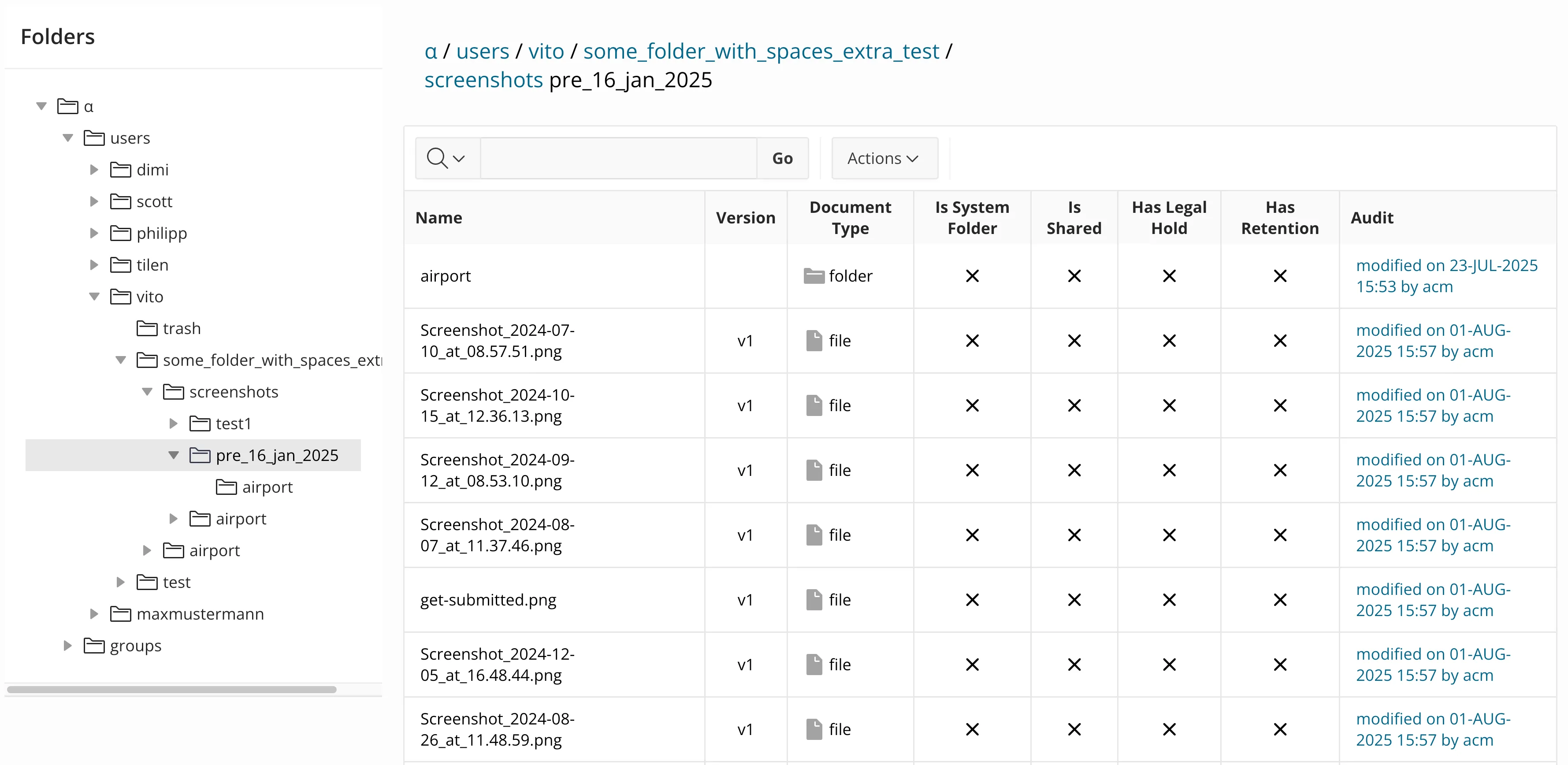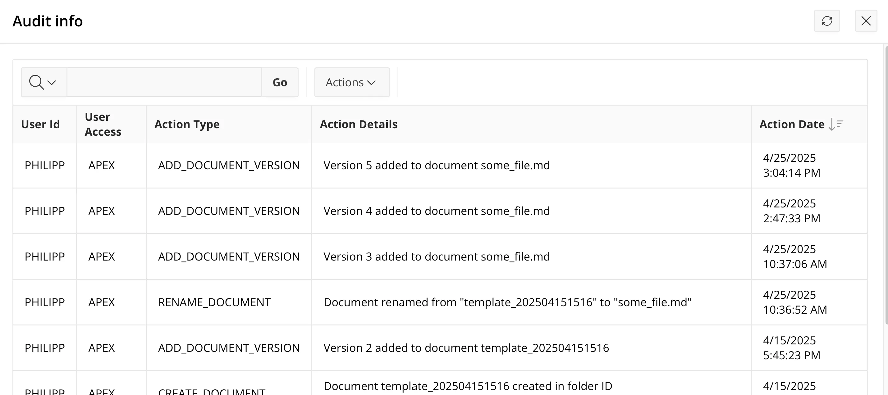 You can access the audit trail from the admin page → “Audit”. Or from the “Root View” page by clicking the audit column on any folder or file.