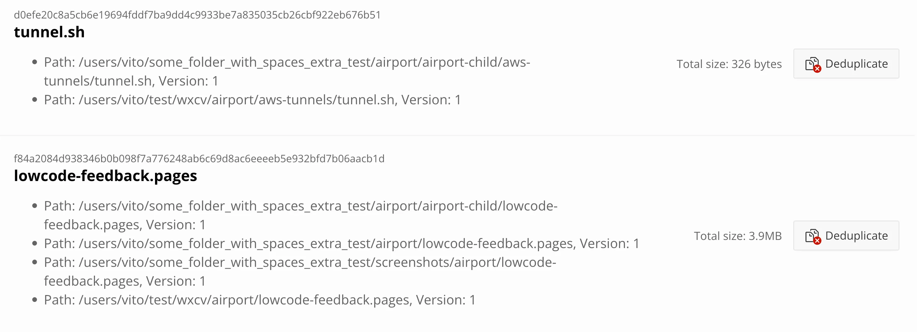 Section titled “Deduplication”The deduplication section allows you to find duplicate files inside the file system. This is useful to clean up storage and ensure that only unique files are stored.
