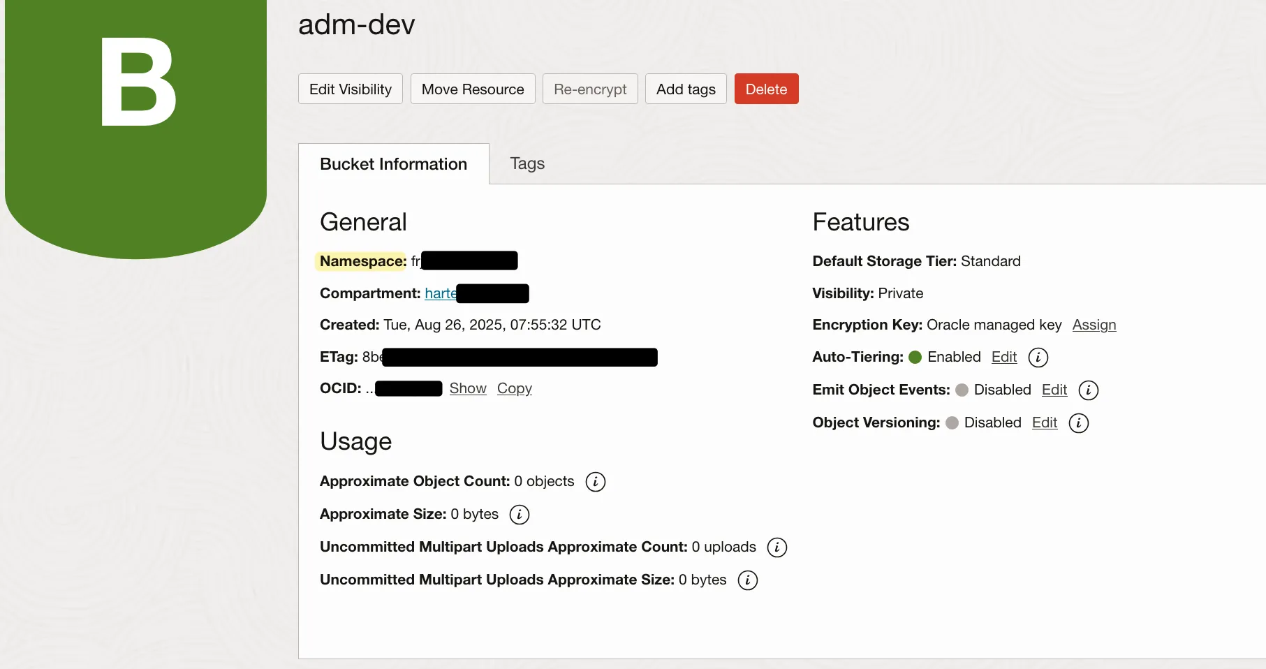 adm_settings_api.configure_object_storage( p_bucket => '{bucket_name}', p_region => '{region_identifier}', p_namespace => '{namespace}', p_credential_id => '{credential_name}', p_verify_checksums => 'Y' );end;/Add configuration