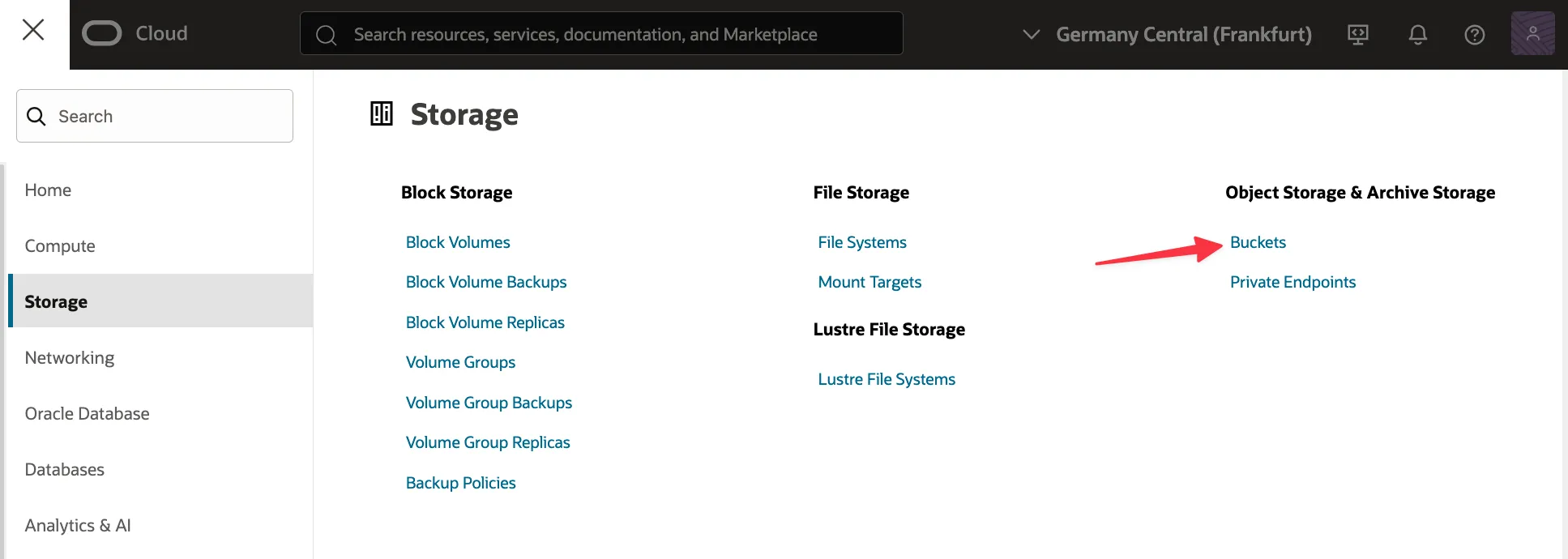 Section titled “Create Bucket”Log-in to your Oracle Cloud Infrastructure (OCI) account and navigate to the Buckets section under Storage.
