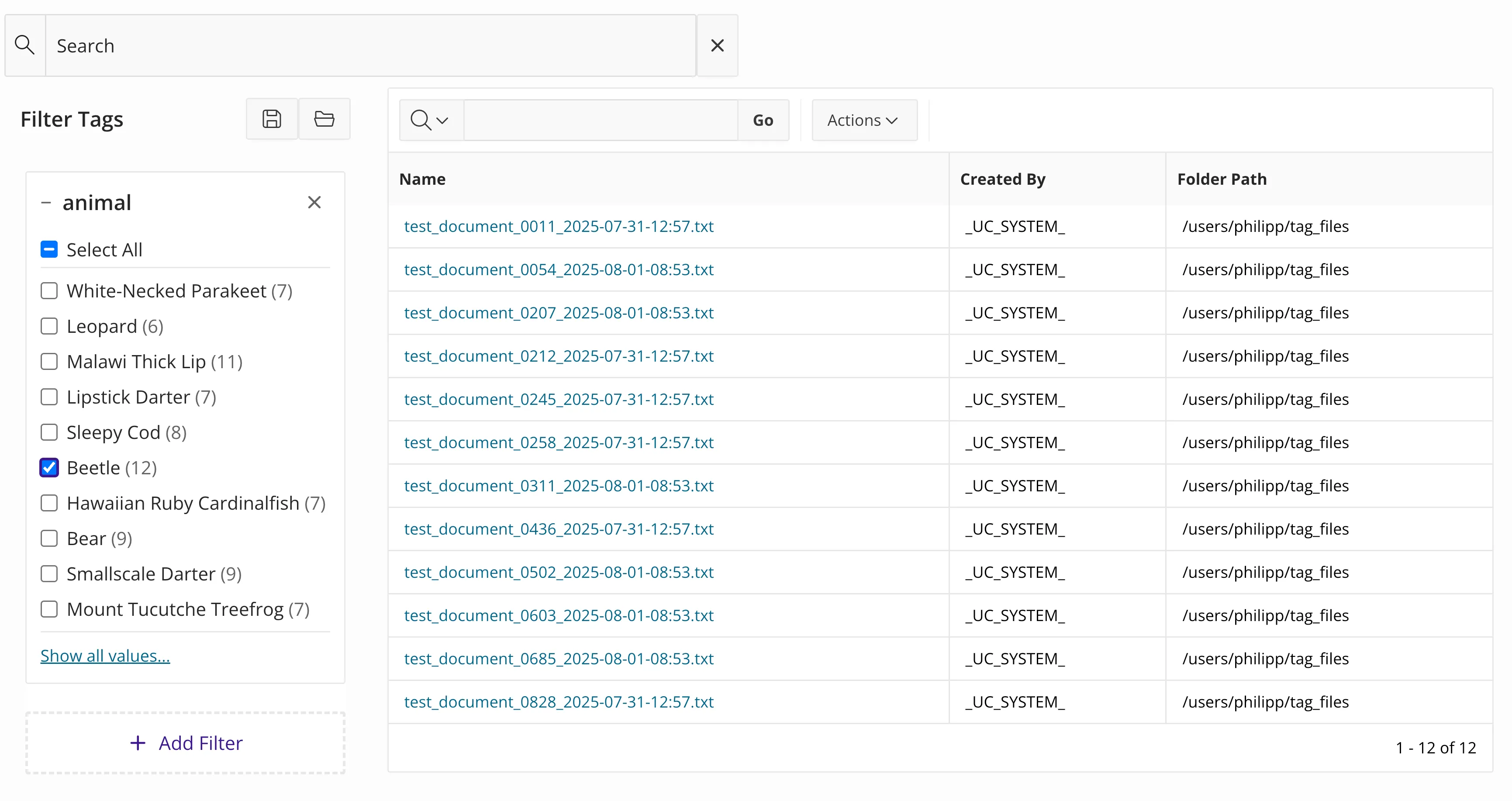 On the search page users can search by filename or full-text file content. Additionally there is a system to tag documents with a key value metadata system. This allows users to categorize documents and find them easily via a faceted search interface.