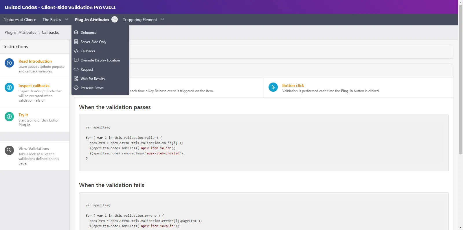 The sample application enables you to learn about the plug-in capabilities, Oracle APEX APEX integration, and simple examples of how to use the United Codes Cient-side Validation Pro plug-in.