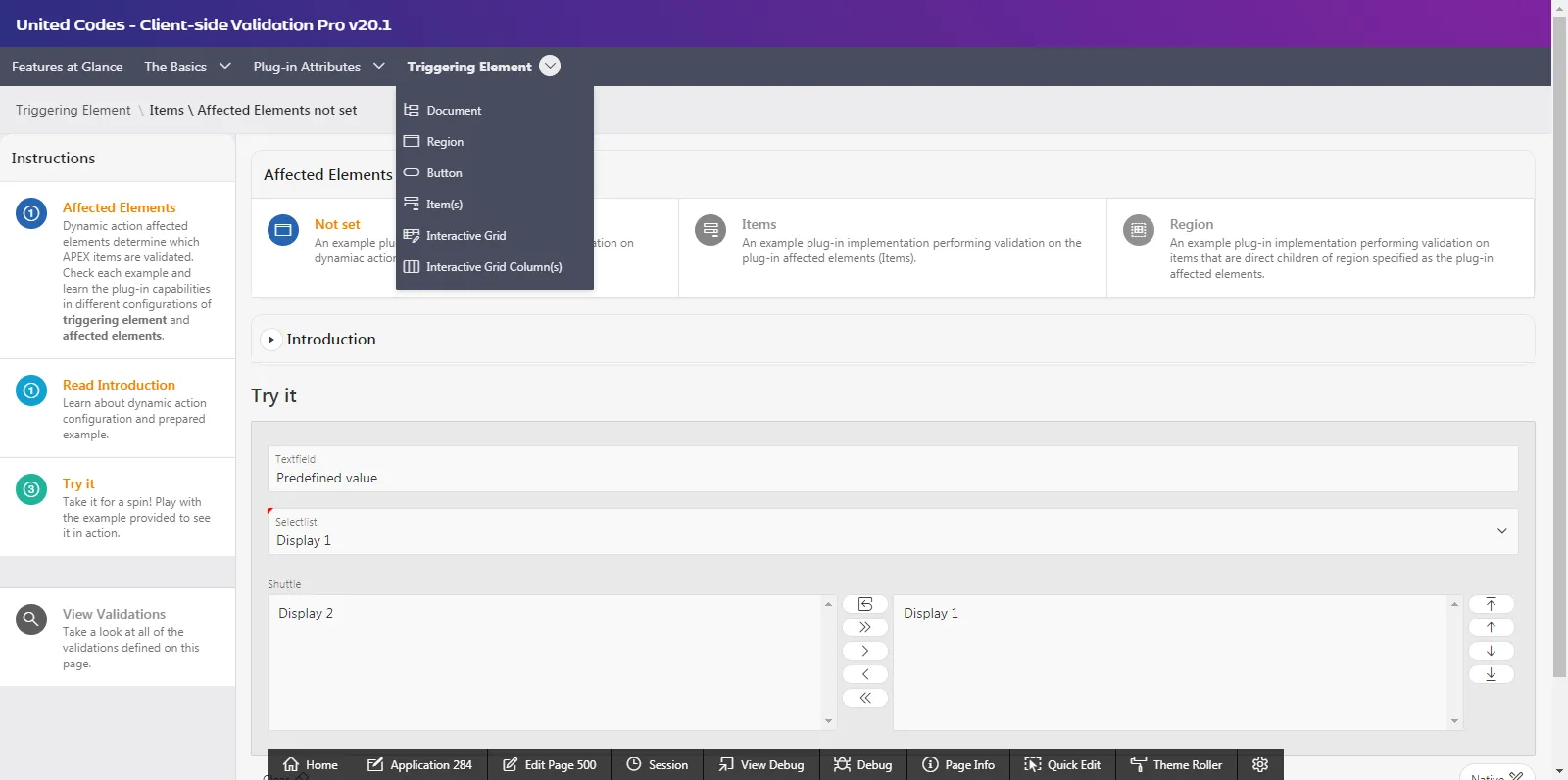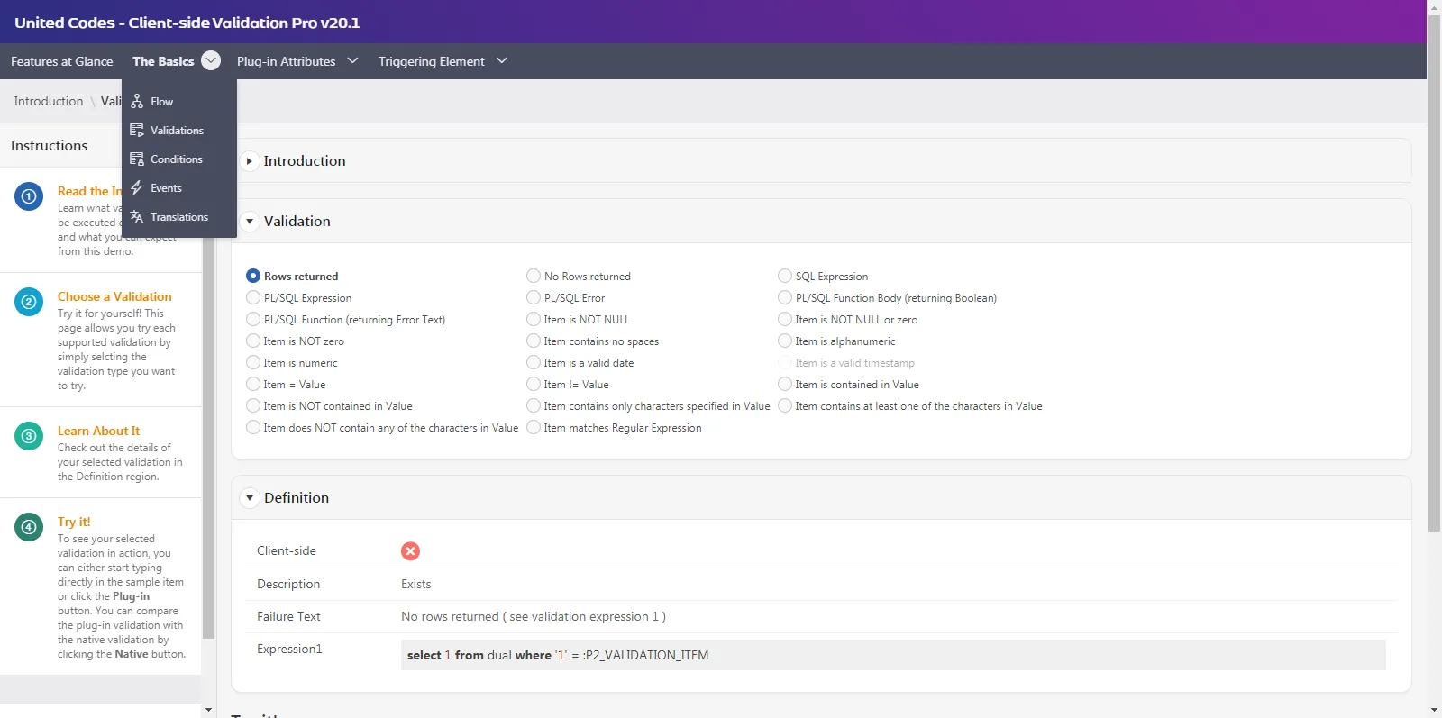 Section titled “The Basics”The basics describe how the plug-in works, how the plug-in events can be used, and allows live testing of the plug-in’s core functionality - evaluating native Oracle APEX validations and validation conditions on the client-side and the server-side.
