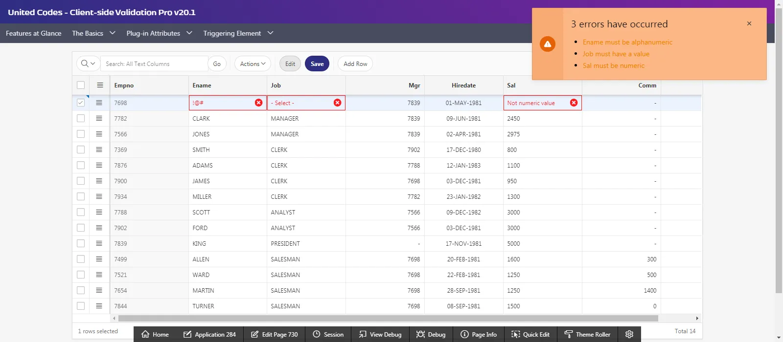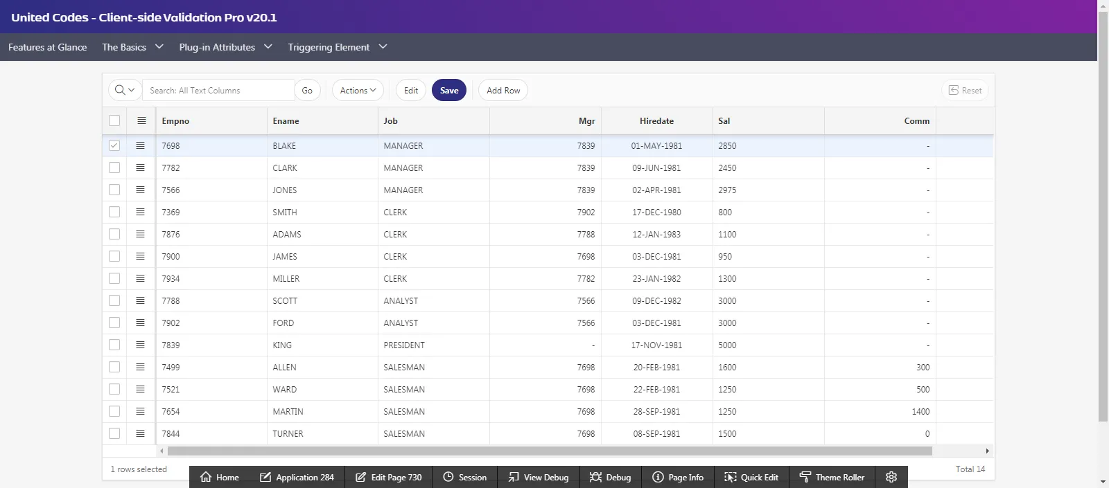 Section titled “Introduction”In an example application, page 730 is defined. On the page, an interactive grid region called Employees is created on the emp table. Columns ENAME, JOB and SAL have native Oracle APEX validations defined as described in the table below: