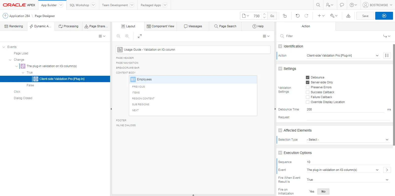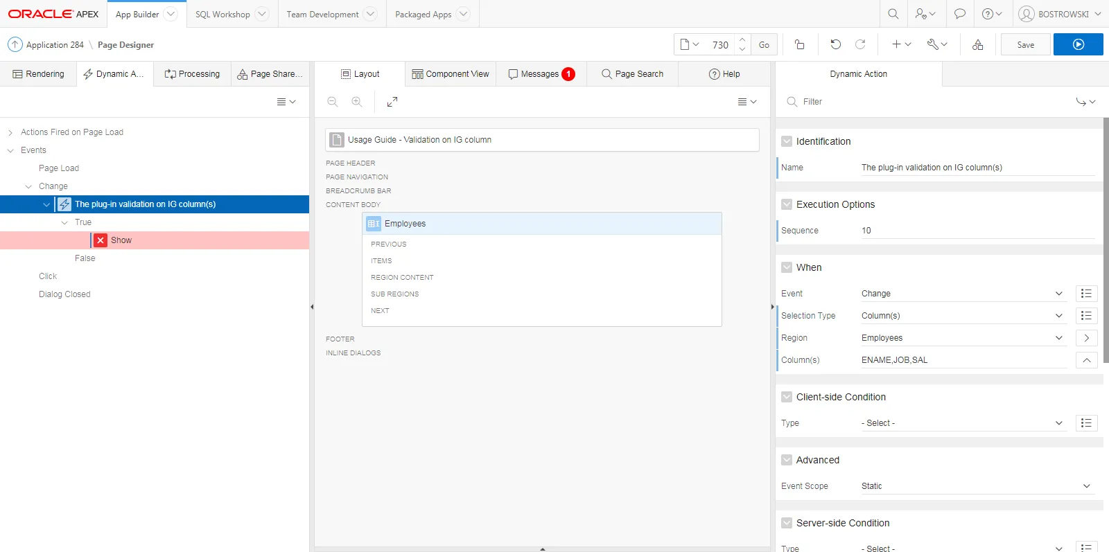 - Change the dynamic action’s name to The plug-in validation on IG column(s)