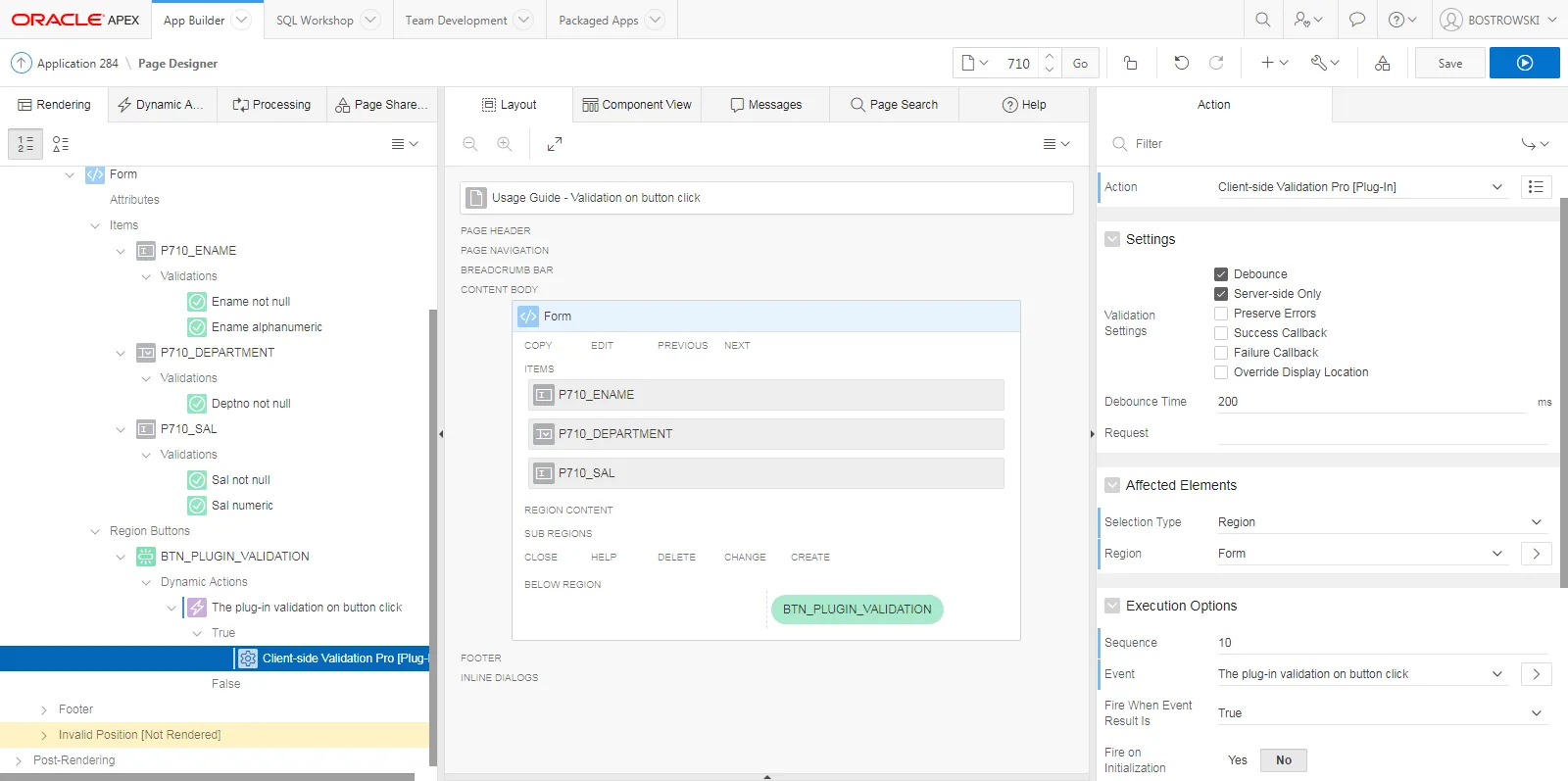 The BTN/_PLUGIN/_VALIDATION button has it’s behavior set to Defined by Dynamic Action and it will be used to trigger the plug-in validation.