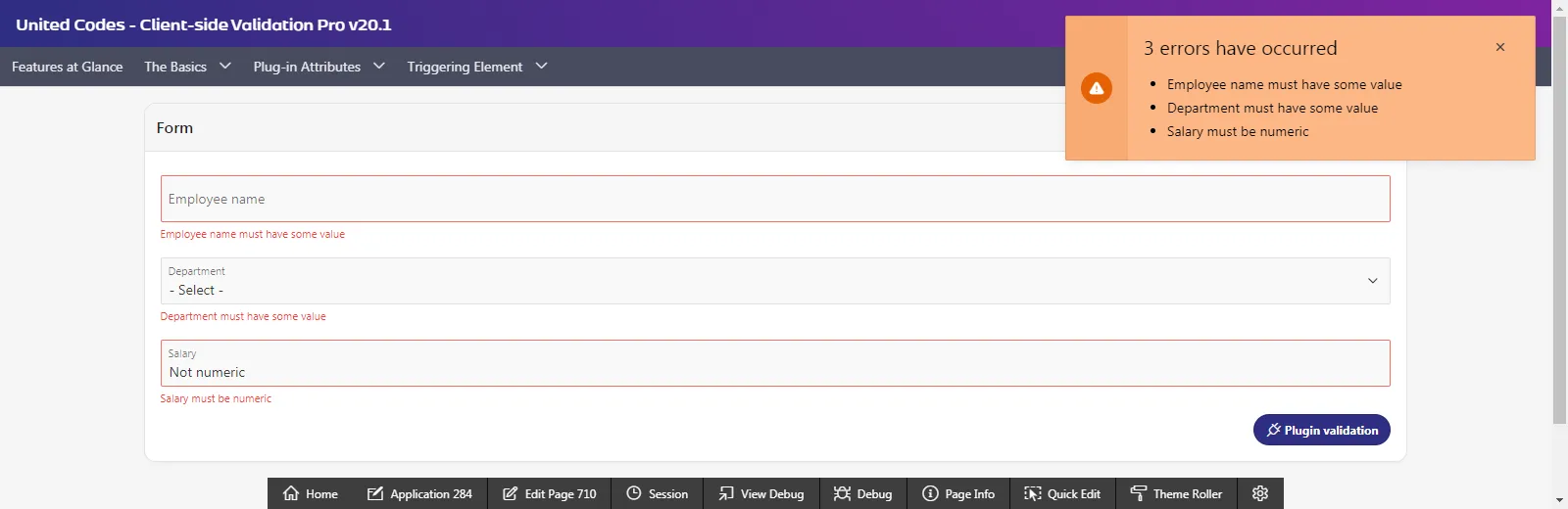 Section titled “Validation on Button Click”This guide describes the plug-in validation performed after clicking the BTN/_PLUGIN/_VALIDATION button. The dynamic action implementing the plug-in only performs validation without submitting the page and doesn’t implement any fancy features of the plug-in.