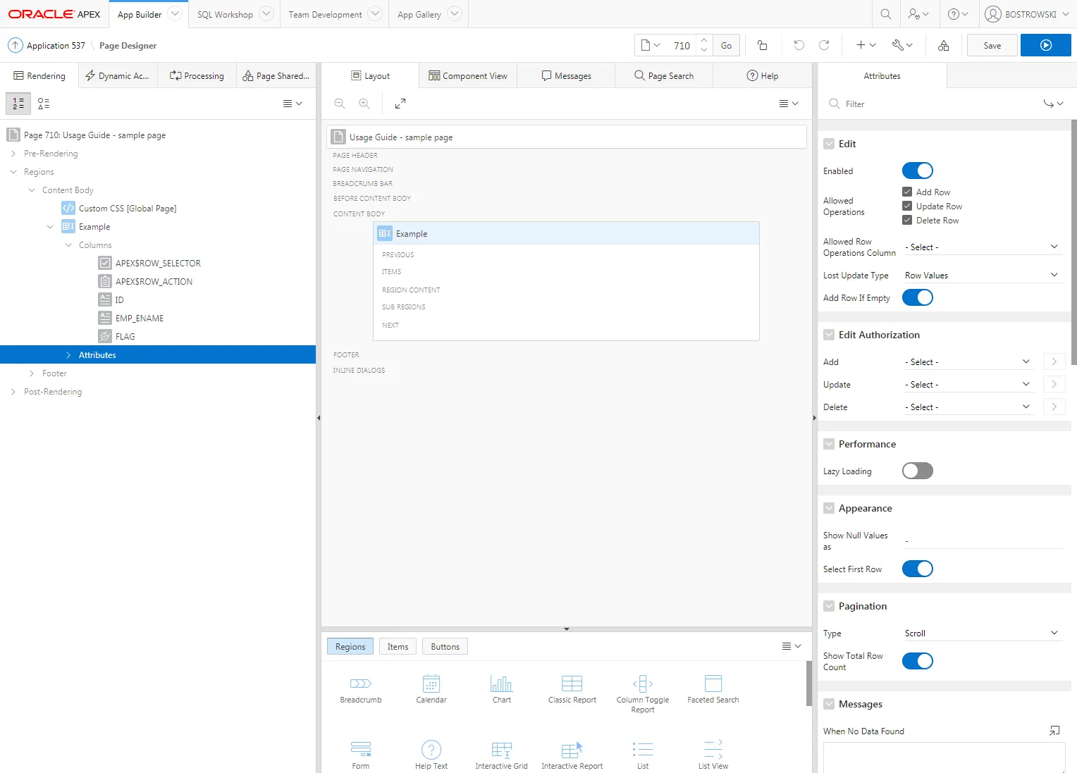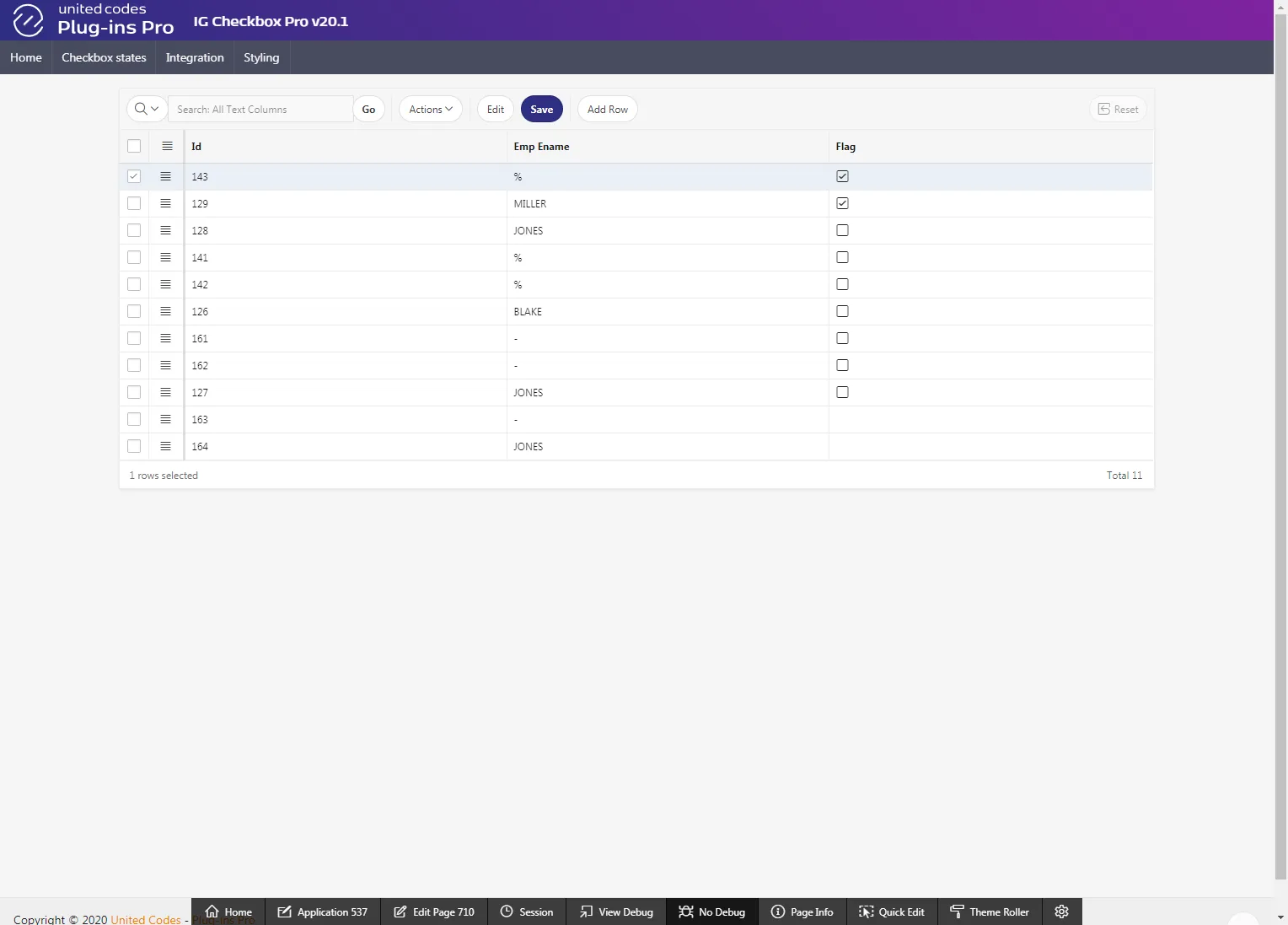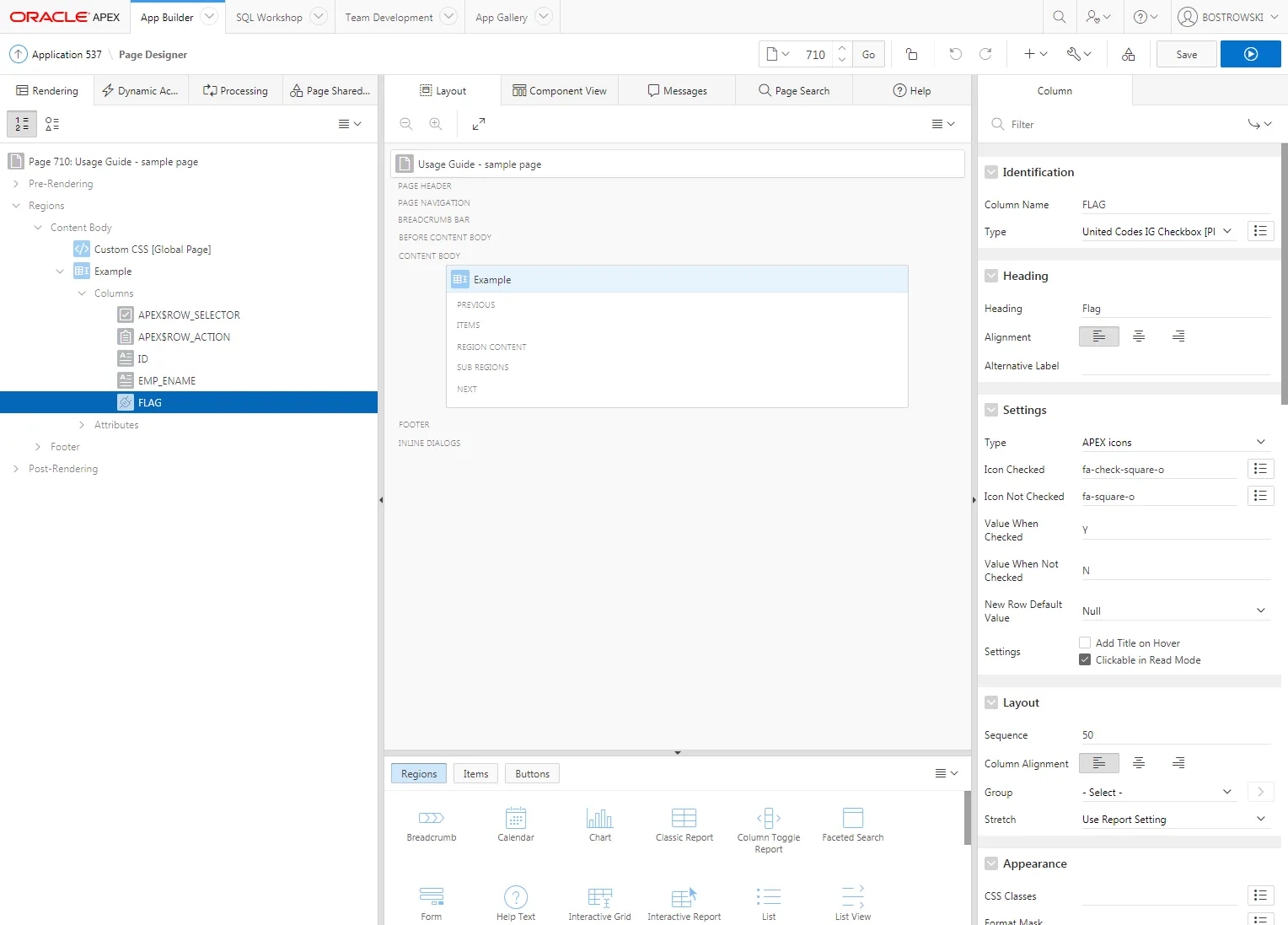 Section titled “Introduction”This usage guide is using the plug-in sample application IG_CHECKBOX_PLUGIN table. In an example application, page 710 is created. On the page, an interactive grid region called Example is created and contains three columns ID, EMP_NAME, and FLAG. The ID and EMP_NAME columns are Display Only and the FLAG column is a Text Field. The interactive grid supports editing and the primary key is set as the ID column.
