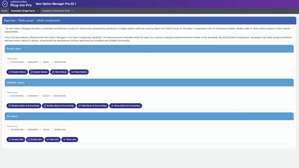 Item Option Manager Pro offers time-saving and declarative support for dynamically disabling, enabling, hiding, and showing single or multiple options. Developers can effortlessly configure option settings based on conditions, eliminating the need for manual coding. This plug-in enhances flexibility and efficiency in option management within APEX applications.